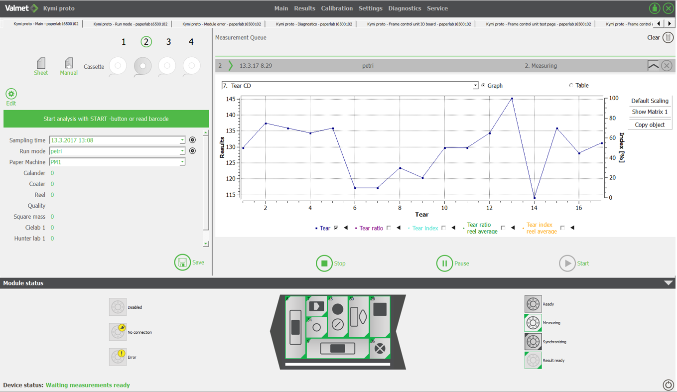 The user interface has been designed to make the life of the operators as easy as possible. Putting the sample into Valmet Paper Lab and entering the sample data is easy and fast. The graphical and dynamic displays guide the user during the operations, showing the measurement results as they come.